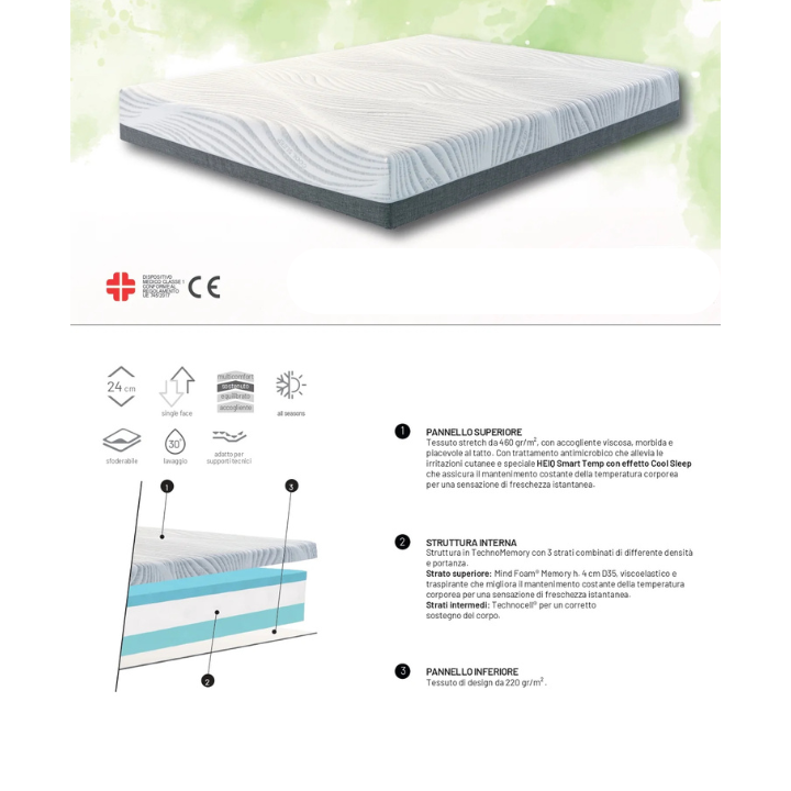 Strato superiore: Mind Foam® Memory h. 4 cm D35, viscoelastico e traspirante che migliora il mantenimento costante della temperatura corporea per una sensazione di freschezza istantanea.