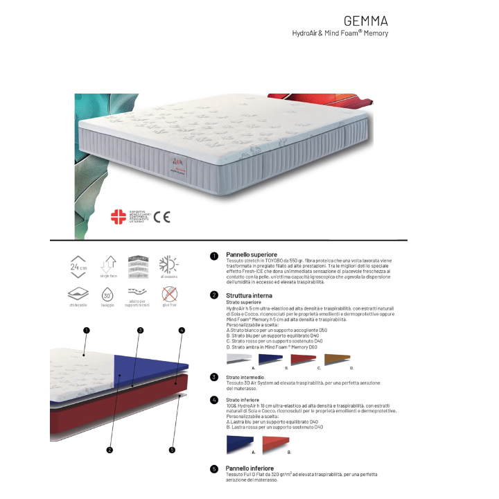 HydroAir h 5 cm ultra-elastico ad alta densità e traspirabilità, con estratti naturali di Soia e Cocco, riconosciuti per le proprietà emollienti e dermoprotettive oppure Mind Foam® Memory h 5 cm ad alta densità e traspirabilità.